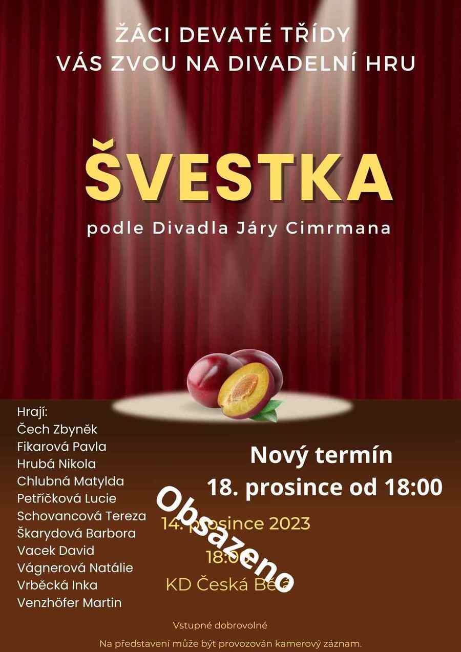 zveme Vás na divadelní hru Švestka v podání žáků deváté třídy. Lístky je nutné zarezervovat v tomto systému.